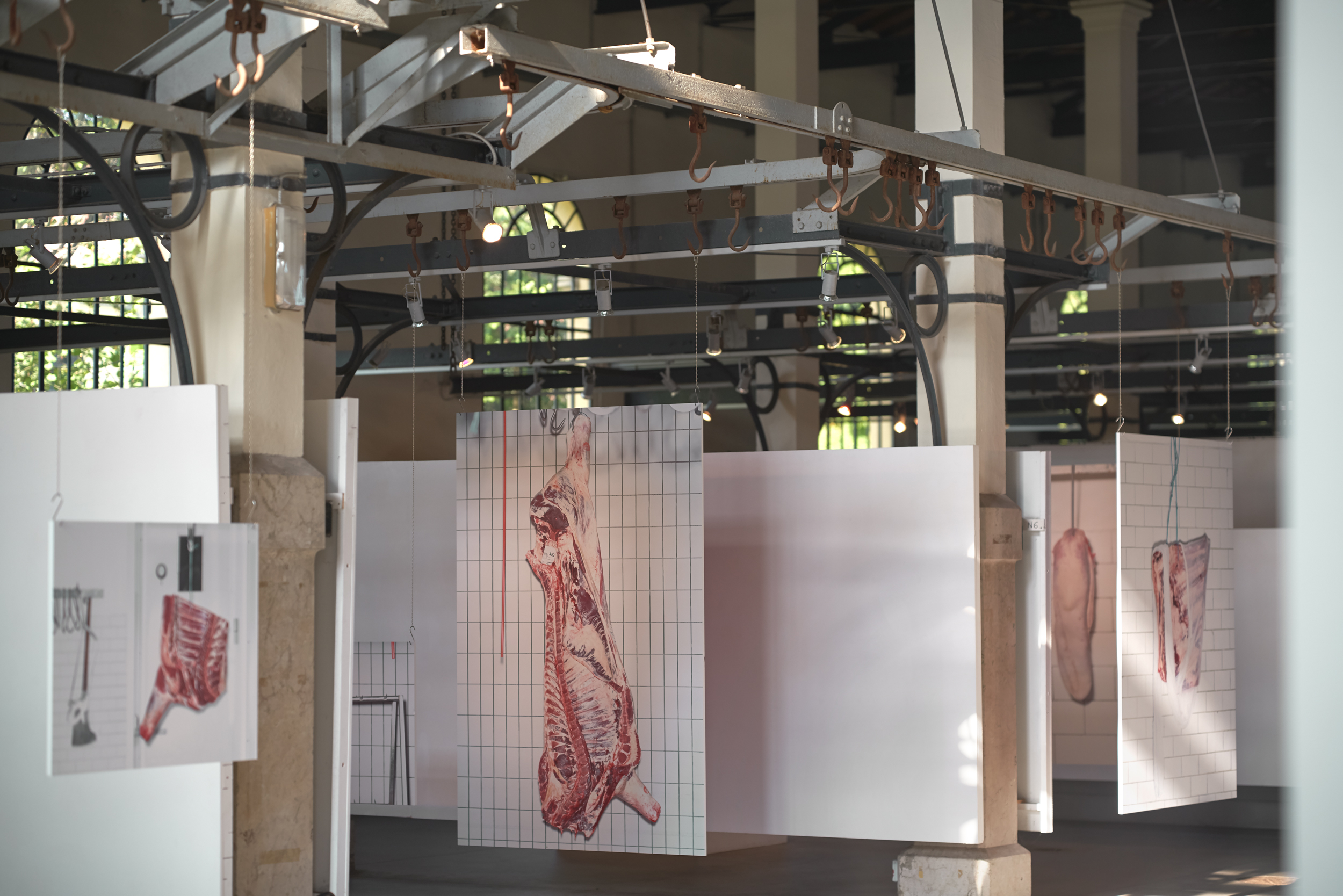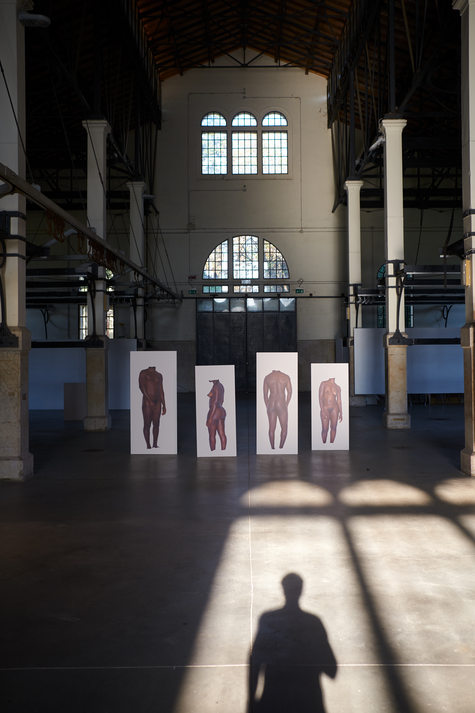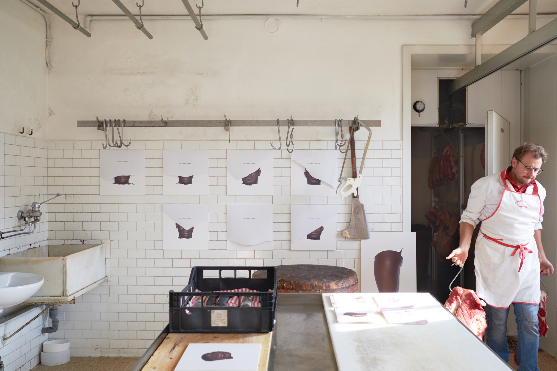 Our Western culture, shaped by the myth of Ulysses, has always seen the traveler as a figure both strong and determined to leave, yet deeply in need of peace and home. And if travelers have always existed, so too have those who welcomed them. «accògliere» [lat. *accollĭgĕre, comp. di ad- e collĭgĕre «cogliere, raccogliere»] To receive, and particularly to receive into one’s home, admit into one’s group, temporarily or permanently; especially with regard to the manner, feeling, and manifestations with which one receives CARNE DA MACELLO personal research – photography – video – exhibition a one day exhibition in Targhetta Butcher’s shop, Castelfranco Veneto, September 2017 a one month exhibition in Cattedrale Ex Macello Padova, September 2018 Pdf presentation (eng – ita) In March 2017, twenty-one young men arrived in the small town of Castelfranco Veneto, in northeastern Italy — the town where I live. Many of them had crossed the Mediterranean Sea just a few days earlier. They were hosted for a few days in a former boarding school, then expelled by the mayor, temporarily housed in some apartment buildings, then driven out by protesting residents. They were moved to gyms, crammed into military barracks, former B&Bs, makeshift shelters — entrusted to cooperatives founded just three days prior — transferred to Rome, to Trieste… Since I met them, it felt natural to form a bond with some of them. And to watch — often helplessly — the light in their eyes slowly fade. MEAT FOR THE SLAUGHTER was born from this: from all the stories of non-welcome disguised as hospitality, which I wasn’t able to show or tell. Together, using nothing more than a blank paper backdrop, we created a metaphor through play. Asking ourselves: “How human are we when we speak of hospitality?”
